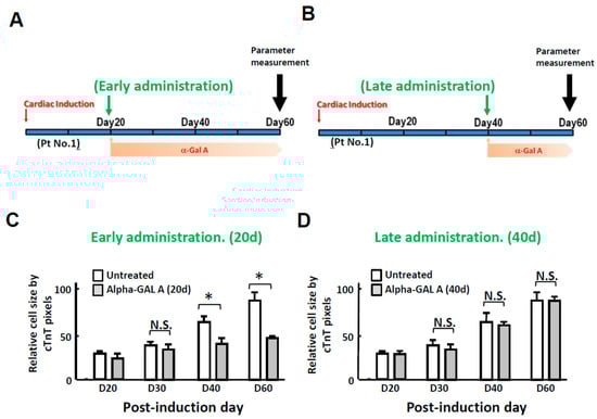 Late administration of α-galactosidase failed to ameliorate cardiomyocyte hypertrophy and upregulation of fibrosis markers. (A) Scheme depicting the experimental design of early administration and (B) late administration of ERT in the FC-iPSC-CM platform. Time-course analysis of the relative size of FC-iPSC-CM cells receiving (C) early-administration and (D) late-administration of α-galactosidase or vehicle. In (C,D), the results are mean ± S.D. of three independent experiments. * p < 0.05 vs. Untreated control, D: Day; N.S.: Not significant.