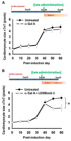 Late administration of α-galactosidase plus Alox12/15 pharmacological inhibitor ameliorates cardiomyocyte hypertrophy. cTnT-positive FC-iPSC-CMs was quantified to evaluate the cell size of FC-iPSC-CM receiving (A) late-administration of either α-galactosidase alone or (B) a combination of GLA and LOXBlock-1. In (A,B), the results are mean ± S.D. of three independent experiments. * p < 0.05 vs. Untreated control at D60.