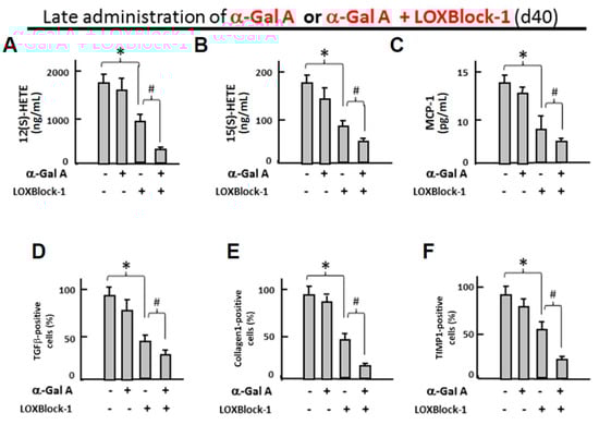 Late administration of α-galactosidase plus Alox12/15 pharmacological inhibitor suppresses the metabolites of Alox12/15, and the expression of MCP-1 and fibrosis markers. Effect of late administration of GLA or a combination of GLA and LOXBlock-1 on I, the secretion of (A) 12(S)-HETE, (B) 15(S)-HETE, and the relative expression ratio of (C) MCP-1 (D) TGFβ, (E) collagen-1, and (F) TIMP-1 in FC-iPSC-CMs. In (A–F), the results are mean ± S.D. of three independent experiments. * p < 0.05 vs. untreated FC-iPSC-CMs. # p < 0.05 vs. LOXBlock-1 alone.