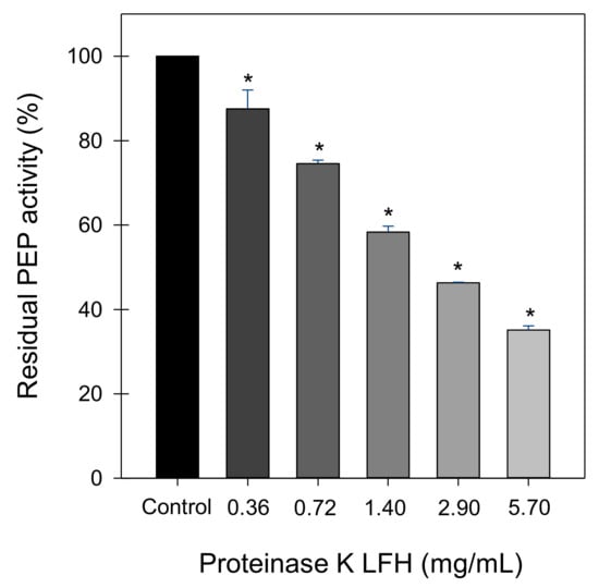 LFHs obtained with three different proteases showed a moderate ability to inhibit PEP that was not shown by non-hydrolysed LF, suggesting that LF-derived peptides possess the inhibitory activity. The hydrolysates generated with three different proteases showed different PEP-inhibitory activities pointing out the importance of peptide sequences for enzyme inhibiting activity. In our study, the most potent LFH was generated using proteinase K, which exhibits specificity for peptide bonds adjacent to the carboxylic group of aliphatic and aromatic amino acids [