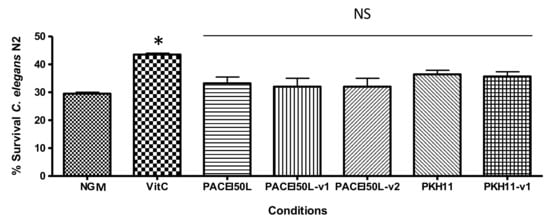 C. elegans protection upon oxidative stress under the conditions tested. Conversely, the antioxidant properties of maize and scorpion venom peptides might underline, at least in part, their protective effect observed in