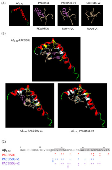 1–42 might impede monomeric interactions and thus, Aβ oligomerization. Docking analysis revealed the loss of hydrogen bonds between non-active PACEI50L variants and these three residues in Aβ