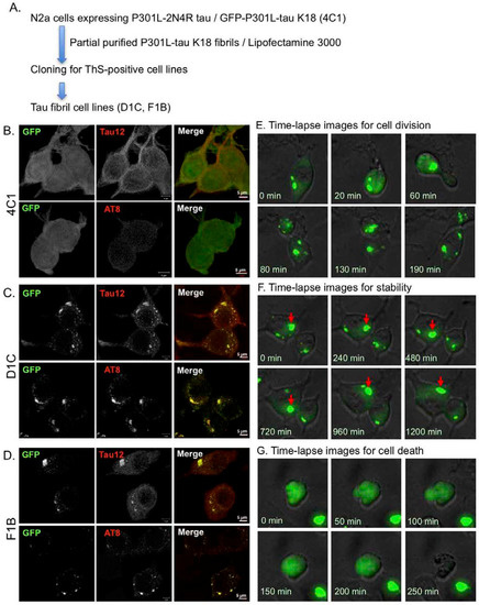 Stable Neuro2a cell lines expressing the human 2N4R tau isoform and repeat domain fragment with the P301L mutation. (A) Schematic representation of cloning for tau fibril cell lines. To generate cells with Tau inclusions, recombinant K18 tau fibrils were transduced into 4C1 cells by lipofectamine 3000. Single cells with GFP-positive inclusion were cloned for generating stable cell lines; (B–D) GFP fluorescence imaging and immunocytochemistry of stable Neuro2a cell lines ((B), 4C1 cell; (C), D1C cell; (D), F1B cell). Methanol-formaldehyde fixed cells were immunolabeled with the Tau12 or AT8 antibody. GFP signal and immunoreactivity were captured by fluorescence microscopy with green and red filters, respectively. Co-localization with GFP and immunoreactivity was indicated by a yellow signal in merged images; (E–G) Time-lapse images of the F1C cell during cell division (E), stable period (F), and cell death (G). GFP fluorescence was captured by an incubator microscope. GFP inclusions were transmitted from mother to daughter cells within an hour (E). Representative images showed a long living inclusion of more than 20 h ((F); red arrow indicates a stable inclusion). The other representative images show a bursting GFP inclusion during cell death (G).