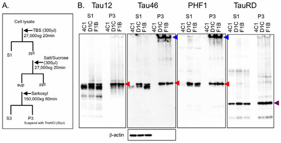For mouse brains, mice were euthanized by cervical dislocation in order to preserve the metabolic environment of the brain and to prevent artifacts that could alter the biochemical profiles of tau. Mouse brains were bisected down the midline to yield two hemispheres. The forebrain of the right hemisphere of each animal was snap frozen on dry ice and stored at −80 °C until processed, as previously described [18]. Tissues were homogenized in 10 volumes of Tris-buffered saline (TBS: 50 mM Tris/HCl [pH 7.4], 274 mM NaCl, 5 mM KCl, 1% protease inhibitor mixture (Sigma, St. Louis, MO, USA), 1% phosphatase inhibitor cocktail I & II (Sigma, St. Louis, MO, USA), 1 mM phenylmethylsulfonyl fluoride [PMSF]). For cell lysates, collected cells were homogenized in 300 μL of TBS (Figure 2A). The homogenates were centrifuged at 27,000× g for 20 min at 4 °C to obtain supernatant (S1) and pellet fractions. Pellets were further homogenized in five volumes for brains or 300 μL for cells (Figure 2A) of high salt/sucrose buffer (0.8 M NaCl, 10% sucrose, 10 mM Tris/HCl, [pH 7.4], 1 mM EGTA, 1 mM PMSF) and centrifuged as above. Supernatants were collected and incubated with sarkosyl (1% final concentration; Sigma, St. Louis, MO, USA) for 1 h at 37 °C, followed by centrifugation at 150,000× g for 1 h at 4 °C to obtain salt and sarkosyl-extractable (S3) and sarkosyl-insoluble (P3) fractions. The P3 pellet was re-suspended in TE buffer (10 mM Tris/HCl (pH 8.0), 1 mM EDTA) to a volume equivalent to half of that of the brain specimens used to produce brain homogenates or in 50 μL of TE buffer for cell lysates (Figure 2A).