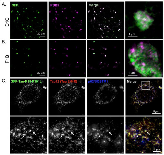 To examine the filamentous status of intracellular tau inclusions in stable cells, we performed fluorescence labeling with PBB5, which is one of the derivatives of tau PET ligand PBB3 [24]. PBB5 is a fluorescent β-sheet ligand similar to thioflavin S, and it selectively binds to filamentous tau aggregates. As a result, the tau inclusions in both D1C and F1B cells were positive with PBB5 fluorescence (Figure 3A,B), suggesting that the tau aggregates in the cells formed a β-sheet structure. To determine the structural characteristics of tau aggregates in cells, we dissected them in F1B cells by super-resolution structured illumination microscopy (SR-SIM) (Figure 3C,D). Tau12 immunoreactivity and GFP fluorescence were perfectly matched in the fibular-structured tau aggregates, suggesting that the cellular tau proteins generated filamentous aggregates containing both full-length tau and K18-tau (Figure 3C). These small tau filaments were mostly AT8 immunoreactive, but some portions of tau fibrils were not phosphorylated (Figure 3D, arrow), suggesting that tau phosphorylation is not essential for tau fibril formation.
