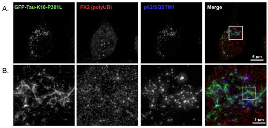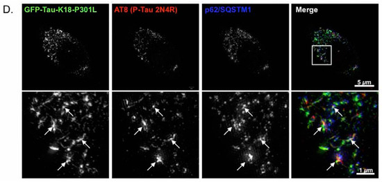 p62 has been used as a marker to monitor autophagic activity. It has been reported that p62 co-localized with tau inclusions in human tauopathies [34,35], as well as in a mouse model expressing P301S mutant tau [36]. Our super-resolution microscopic analysis revealed that p62 was rarely co-localized with tau filaments in our cell lines. This suggests that the cellular protein degradation systems, including UPS and the p62-mediated aggrephagy pathway, cannot find the aggregated tau proteins to remove them through protein degradation processes. Therefore, great numbers of small tau fibrils can remain in cells and the elongated filaments can form large-sized tau inclusions. Although the cells with large tau inclusions will eventually die, small filamentous tau aggregates may not be toxic in our tau fibril cell lines, because these aggregates are stable in the cytosolic region and do not interfere with cellular division and proliferation (Figure 1F). Although the NFTs in human brain are ubiquitin-positive [37,38,39], it may be possible that the majority of tau fibrils are not polyubiquitinated but that the inclusions sequestrate a number of polyubiquitinated proteins, as well as p62. Further investigations are required to confirm these possibilities.