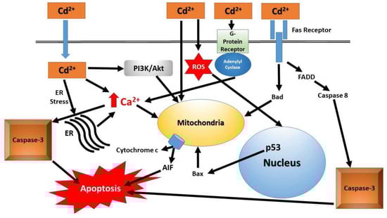 - Al-Assaf, A.H.; Alqahtani, A.M.; Alshatwi, A.A.; Syed, N.A.; Shafi, G.; Hasan, T.N. Mechanism of cadmium induced apoptosis in human peripheral blood lymphocytes: The role of p53, Fas and Caspase-3. Environ. Toxicol. Pharmacol. 2013, 36, 1033–1039. [Google Scholar] [CrossRef] [PubMed]