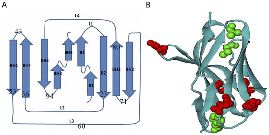 The topology of selected Ig-like β-sandwich domains and the location of mutations. (A) Topology of Ig-like β-sandwich domains. The secondary structures are β-strand B1: residue 1-12, linker L1: residue 13-15, B2: 16-24, L2: 25-35, β-hairpin BH1: 36-43 & 44-51, L3: 52-63, BH2: 64-70 & 71-80, L4: 81-85, and β-hairpin BH3: 86-96 & 97-110. The β-sheet region was identified using the DSSP program [49]. (B) The tertiary structure of Ig-like β-sandwich domains with the mutations highlighted with solid spheres: read ones are hydrophilic-to-hydrophobic mutations while green ones are the reverse mutations. The is figure was prepared using VMD software [50].