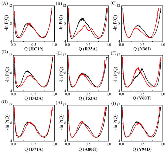 The conformations in TSEs of Ig-like β-sandwich folds are sorted with respect to Q value—the total number of native contacts that are preserved in given conformation normalized by the total number of native contacts found in native states. Q value varies between 0 and 1, corresponding to the fully unfolded states and the fully folded native states, respectively. The apparent free energy of the system in terms of Q-value can be derived as the negative log of the conformation distribution probability . In VTF simulations, an averaged collapse temperature is used in determining the free energy temperature factor . Figure 2 compares the apparent “free energy” landscapes for the two models. The changes in free energy landscape are recognized as the shift of the location of central energy barrier, which corresponds to the TSEs. Essentially, two groups exist: one group takes right-shift with the free energy profile shifting to the high Q-value end, indicating more native contacts that are preserved in TSEs. The second one takes a left-shit with less native contacts in TSEs. Five domains HC19, R23A, D43A, D71A, and Y94D have a right-shifted free-energy change, a common change been observed in the folding of Im9 all-α proteins [51]. However, different from that in all-α proteins, left-shifted free-energy change also happened in N36I, T53A, V60T, and A80G, indicating nonnative-contact energetic frustrations destroys some native contacts in TSEs. Further, significant lower barriers were observed in domains R23A and D43A, which is different from that in all-α proteins where energetic frustrations tend not to decrease the barriers [51]. Wolyens and colleagues examined the folding of three typical proteins, namely the all-α, α/β and all-β proteins [46], and showed that the introduction of the native energetic frustration essentially tends to lower the free-energy barrier. When compared with native energetic frustrations, the nonnative ones in all-β structures can either increase or decrease the barrier in significant level, and they can either facilitate or impair the formation of native-contacts in TSEs depending the introduced nonnative-contact locations.