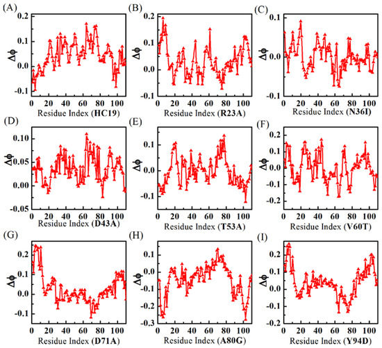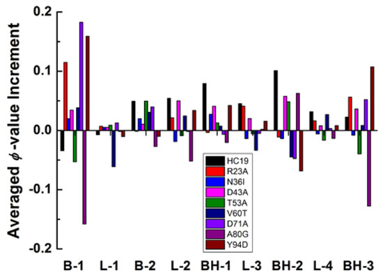 Figure 3 shows residual ϕ-value-changes derived from the two models. The absolute ϕ-values (see Supplementary Figure S2) fall short of experimental measurements [52] (see a comparison with experimental ϕ-values in Supplementary Figure S3), possibly because the simulations were done in vacuum while experiment measurements were performed in water. In this sense, the relative ϕ-values make more sense than the absolute values. When compared with all-α Im9 domains, the calculations show that all-β domains have more irregular residual ϕ-value changes upon energetic frustrations. For example, no significant residual ϕ-value change is found in both domains N36I and T53A, indicating the effects of energetic frustrations in these proteins are ignorable. For V60T, the residual ϕ-values decrease in BH2 is balanced by increase in B1, leaving an averaged ϕ-value almost unchanged. In HC19, significant ϕ-value increases are found in linker L2, β-hairpins BH2, and BH3, while a small decrease happens in the first β-strand B1. R23A has detectable ϕ-value increase in B1, BH3, and C-strand of L3. D43A has small increases in B1, L2, N-strand of BH1, and N-strand of BH2. D71A has larger ϕ-value increases in B1 and detectable decreases in BH2. In A80G, residual ϕ-values become smaller in B1 and BH3. Y94D obtains significant ϕ-value increases in B1 and BH3, and small decrease in BH2.