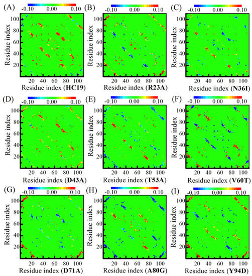 The contact difference maps for the nine β-sandwich domains. The difference of contact map is associated with the local environments of site-mutations. Different mutants are indicated by IDs (see caption of Table 1) inside the parenthesis of x-coordinate titles for A-I.