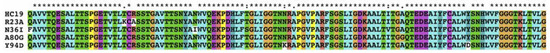 Sequence alignment of the five selected Ig-like β-sandwich domains selected from SCOP. The abbreviations read HC19: d1gigl1, R23A: d4a6yl1, N36I: d1etzl1, A80G: d2y06l1, Y94D: d3ks0l1. Additional four structures are derived from HC19 by artificial single-site mutation at site D43, T53, V60 and D71, and named as D43A, T53A, V60T, D71A, respectively.