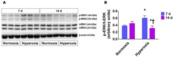 Lung phosphorylated extracellular signal-regulated kinases (ERK)1/2 protein levels in neonatal wild-type (WT) mice exposed to hyperoxia. Lung proteins obtained from neonatal WT mice exposed to 21% O2 (normoxia) or 70% O2 (hyperoxia) for up to two weeks (n = 6/exposure) were subjected to immunoblotting using antibodies against total ERK1/2, phosphorylated ERK1/2, or β-actin. Representative immunoblot showing total ERK1/2 and phosphorylated ERK1/2 protein expression (A). Densitometric analyses wherein the phosphorylated ERK1/2 band intensities were quantified and normalized to those of total ERK1/2 (B). The values are presented as mean ± SD. Significant differences between the normoxia and hyperoxia groups are indicated by * p < 0.05. Significant differences between the hyperoxia groups are indicated by † p < 0.001 (Two-way ANOVA).