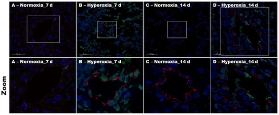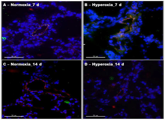 A separate group of pups were euthanized at one and two weeks of life (n = 6/exposure/time-point), and their lungs were inflated and fixed via the trachea with 10% formalin at 25 cm H2O pressure for at least 10 min. Sections of the paraffin-embedded lungs were obtained for immunofluorescence studies and for the analysis of lung vascularization, as described previously [59].