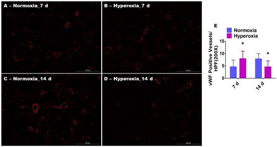 We next determined pulmonary vascularization by quantifying the vWF-stained lung blood vessels. Interestingly, the changes in pulmonary vascularization followed an pattern identical to that of lung endothelial cell ERK1/2 activation in hyperoxia-exposed animals. One week of hyperoxia exposure (Figure 3A,B,E) significantly increased the number of vWF-stained lung blood vessels (7.3 ± 3.4 vs. 4.6 ± 2.7), whereas prolonged (two weeks) hyperoxia exposure (Figure 3C–E) decreased the number of blood vessels (4.9 ± 2.4 vs. 7.4 ± 2.4) in comparison with normoxia-exposed mice.