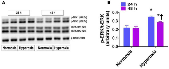 Phosphorylated ERK1/2 protein levels in human pulmonary artery endothelial cells (HPAECs) exposed to hyperoxia. HPAECs were exposed to normoxia or hyperoxia for 24 or 48 h, following which whole-cell proteins were extracted, and immunoblotting was performed using antibodies against total ERK1/2, phosphorylated ERK1/2, or β-actin. Representative immunoblot showing total ERK1/2 and phosphorylated ERK1/2 protein expression (A). Densitometric analyses wherein the phosphorylated ERK1/2 band intensities were quantified and normalized to those of total ERK1/2 (B). The values are presented as mean ± SD (n = 6/group). Two-way ANOVA analysis showed an effect of hyperoxia and duration of exposure and an interaction between them for the dependent variable, p-ERK1/2, in this figure. Significant differences between normoxia- and hyperoxia-exposed cells are indicated by * p < 0.001. Significant differences between hyperoxia-exposed cells are indicated by † p < 0.01 (Two-way ANOVA).