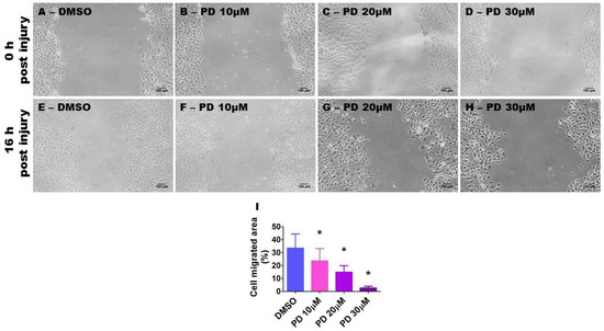 Suppression of ERK1/2 activity decreases HPAEC migration. HPAECs grown as monolayers in six-well plates were treated with 10 µg/mL of mitomycin for 2 h and scratched with a 200 µL pipette tip. The cells were then treated with dimethylsulfoxide (DMSO) or PD98059 at concentrations of 10 (PD 10), 20 (PD 20), or 30 (PD 30) µM. The wound closure area was analyzed using Image J software after 16 h of treatment. (A–H) Representative photographs showing cell migration. (I) Quantitative analysis of cell migration. The values are presented as mean ± SD (n = 6/group). Significant differences between DMSO- and PD-treated cells are indicated by *, (DMSO vs. PD 10 [p < 0.05]; DMSO vs. PD 20 and PD 30 [p < 0.001]) (One-way ANOVA). Scale bar = 100 µM.