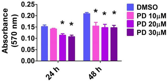 The MTT activity reflects the cell number, and, thus, the measured absorbance positively correlates with cell proliferation. As expected, there was a time-dependent effect on cell proliferation in vehicle-treated cells. Their proliferation rate increased by 38% in 24 h (Figure 8). However, PD98059 decreased cell proliferation in a dose-dependent manner (Figure 8). When compared with vehicle-treated cells, 10, 20, and 30 µM of PD98059 inhibited cell proliferation by 6.7, 26.4, and 29.1%, respectively, at 24 h and by 25, 29, and 30.8%, respectively, at 48 h.
