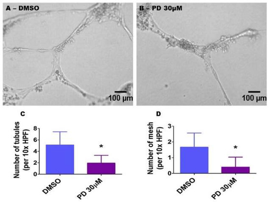 A Matrigel assay was performed to determine the extent of tubule and mesh formation in cells treated with the vehicle or with 30 µM PD98059. Consistent with its effects on cell proliferation and migration, PD98059 decreased HPAEC tubule (1.9 ± 1.3 vs. 5.1 ± 2.3) (Figure 9A–C) and mesh (0.4 ± 0.6 vs. 1.7 ± 0.9) (Figure 9A,B,D) formation, in comparison with vehicle-treated cells.