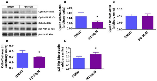 ERK1/2 inhibition affects the expression of cell cycle regulatory proteins. HPAECs were treated with dimethylsulfoxide (DMSO) or 30 µM PD98059 (PD 30) for 24 h, after which whole-cell protein were extracted, and immunoblotting was performed using antibodies against the following proteins: cyclin A, cyclin D, Cdk4, p27, and β-actin. Representative immunoblots showing the expression of the above proteins (A). Densitometric analyses wherein cyclin A (B), cyclin D (C), Cdk4 (D), and p27 Kip 1 (E) band intensities were quantified and normalized to those of total β-actin. The values are presented as mean ± SD (n = 6/group). Significant differences between DMSO- and PD-treated cells are indicated by * p < 0.05 (t-test).