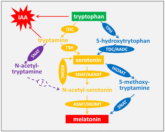 In the animal system, melatonin is secreted in the pineal gland. However, there is no such organ in plants, and this difference implies that the melatonin biosynthesis pathway in plants is slightly different from that in animals. Contrary to the animal system, melatonin distributes in various organs, such as the root, stem and leaf in plants. Multiple factors can stimulate melatonin biosynthesis in plants. Light is one environment factor that regulates the biosynthesis of melatonin [27]. In addition, the development process, such as fruit maturation [28], leaf development [29] and senescence [30], and environment stresses, including ultraviolet-B (UV-B) radiation [31], drought, cold [32] and heat [33], are involved to stimulate biosynthesis of melatonin. In a wide range of plant species, melatonin biosynthesis begins from tryptophan. It is catalyzed by tryptophan decarboxylase (TDC) and converted to tryptamine, and then tryptamine 5-hydroxylase (T5H) catalyzes tryptamine to serotonin, which will be converted to melatonin via two steps [34]. In some other plants, such as Hypericum perforatum, tryptophan is catalyzed into 5-hydroxytrytophan by tryptophan 5-hydroxylase (TPH), and then TDC/AADC (aromatic-l-amino-acid decarboxylase) converts 5-hydroxytrytophan to serotonin [35]. This pathway is the same as that in animals. In the next two steps, serotonin is converted to N-acetyl-serotonin by serotonin N-acetyltransferase (SNAT)/arylalkylamine N-acetyltransferase (AANAT), and then N-acetyl-serotonin methyltransferase (ASMT)/hydroxyindole-O-methyltransferase (HIOMT) catalyzes N-acetyl-serotonin into melatonin. Additionally, tryptamine can be catalyzed by SNAT into N-acetyl-tryptamine, which is not further converted into N-acetyl-serotonin by T5H [36]. It is difficult to determine whether there is a pathway to converting N-acetyl-tryptamine into N-acetyl-serotonin. The other pathway is to convert serotonin into 5-methoxy-tryptamine by HIOMT and, finally, to catalyze 5-methoxy-tryptamine into melatonin by SNAT [37,38] (Figure 1). Meanwhile, the chemical structures of the compounds are showed in Figure 2. Recently, a reverse melatonin pathway was reported, in which N-acetyl-serotonin is converted into serotonin by N-acetyl-serotonin deacetylase [39]. Furthermore, tryptophan is not only the resource of melatonin, but also the precursor of indole-3-acetic acid (IAA), maybe implying the multifunctional role of melatonin in plants.