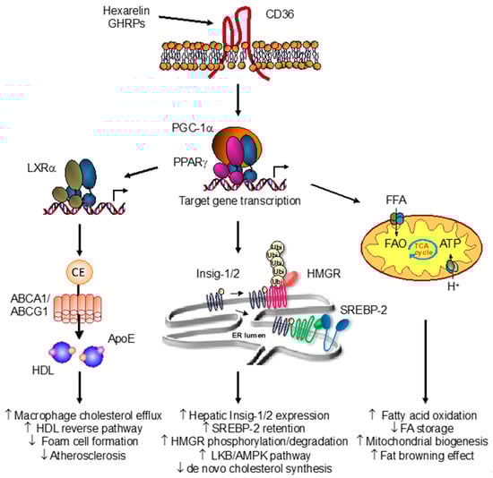 - Avallone, R.; Demers, A.; Rodrigue-Way, A.; Bujold, K.; Harb, D.; Anghel, S.; Wahli, W.; Marleau, S.; Ong, H.; Tremblay, A. A growth hormone-releasing peptide that binds scavenger receptor CD36 and ghrelin receptor up-regulates sterol transporters and cholesterol efflux in macrophages through a PPARγ-dependent pathway. Mol. Endocrinol. 2006, 20, 3165–3178. [Google Scholar] [CrossRef] [PubMed]