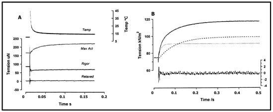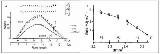 On the basis of the characteristics of their force, three functional and mechanics states may be recognised in skeletal muscle, namely the resting (or relaxed) state, the rigor state, and the active state. Interestingly, these three mechanical states also differ with respect to temperature-effect on their tension [21]. The resting muscle tension is largely temperature-insensitive. In resting state, the crossbridges remain detached, and force develops on stretching beyond rest length; this resistance to stretch arises from stretch of non-crossbridge structures in sarcomeres, such as titin filaments that attach thick filament ends to the Z-discs in sarcomere. The resting muscle force is considered to be “rubber-like”, and increases slightly at higher temperatures. Stretched resting muscle, however, can develop a type of “active” force, due to heat-contracture at high temperatures [21,22]. In rigor, with no ATP, all crossbridges remain attached to actin, but they are not cycling; muscles are stiff, and this force decreases slightly and linearly with increase of temperature (exothermic), like in a normal elastic element (after death, muscles go into rigor). In active muscle, crossbridges are cycling, i.e., they attach to actin, develop force, and detach, and, as presented below, active force is very sensitive to temperature and rises with temperature upon absorption of heat; this process is endothermic.