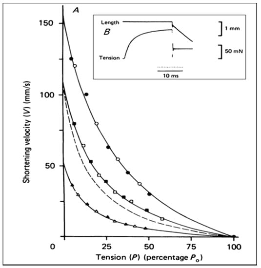 - Hill, A.V. The heat of shortening and the dynamic constants of muscle. Proc. R. Soc. Lond. B 1938, 126, 136–195. [Google Scholar] [CrossRef]
