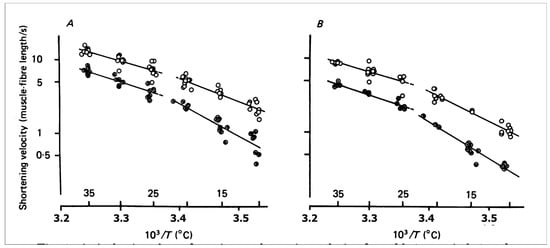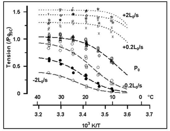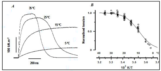 - Hill, D.K. The effect of temperature in the range 0–35 °C on the resting tension of frog’s muscle. J. Physiol. 1970, 208, 725–739. [Google Scholar] [CrossRef] [PubMed]