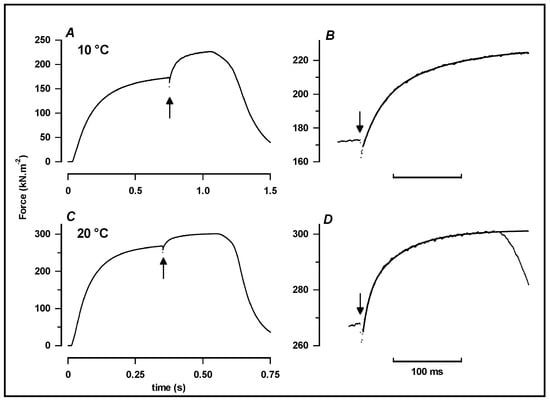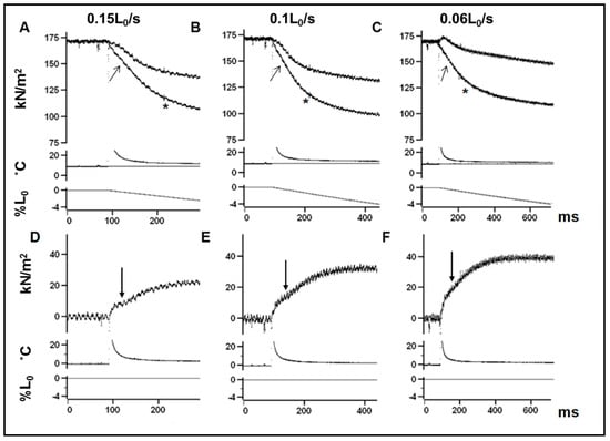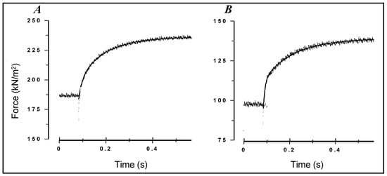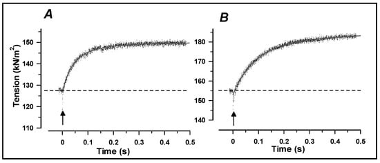 On the basis of the observations in Figure 13, it was of interest to examine T-jump effect at higher shortening velocities to cover the full force–velocity curve. Such a study [68] showed that at ramp velocities approaching Vmax (~1–2 L0/s) at this temperature (~9 °C), a small T-jump induces a very fast tension rise. Pooled data from this study are shown in Figure 14.