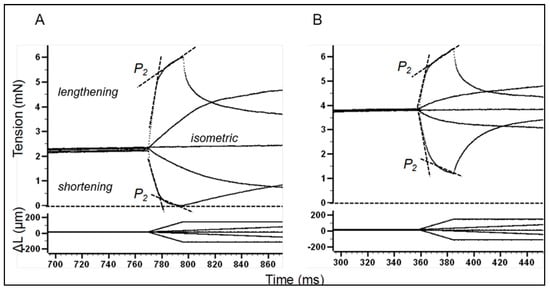 Records of tension (upper panel) and length (lower panel) from a muscle at 10 °C (A) and at 35 °C (B); isometric force (P0) is nearly doubled at 35 °C. At the isometric tetanus plateau, a ramp shortening or lengthening of ~6% was applied (bottom traces) at two velocities, 0.25 and 2.3 L0/s. The tension at the (P2) transition was measured (adapted from Roots et al. [43]) at the point of intersection between two lines, fitted as shown (this represents crossbridge force during shortening/lengthening). The dashed line represents zero active force level.