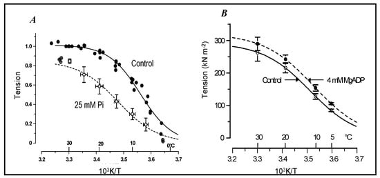 A sigmoidal temperature dependence of isometric force, similar to intact fibres, is seen in maximally Ca-activated skinned fibres [21], Figure 9 from two studies (Coupland et al. [13,46]) show the effect of increased inorganic phosphate (Pi) and MgADP (Pi and MgADP are two products released during crossbridge cycling; Pi is released earlier, and ADP later in the cycle [47,48,49,50,51,52]). Figure 9A shows that active force is depressed by Pi so that the curve is shifted to higher temperatures. Figure 9B shows that MgADP increased force, and the curve is shifted to lower temperatures. It is also seen that the relative effects on tension at a given level of Pi (or ADP) is less at higher temperature (the force depression by 25 mM Pi is ~50% at ~10 °C, where as it is ~20% at physiological temperatures of ~30 °C, Figure 9A).