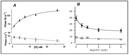 From experiments, as in Figure 10 and Figure 11 (T-jump from ~9 to 12 °C), the mean (±SEM) phase 2b rate (filled symbols), and phase 3 rate (open symbols) are shown. (A) Pi-dependence: the phase 2b rate increases with Pi, to a plateau, and the relation is hyperbolic (the curve fitted). Phase 3 shows minimal sensitivity to Pi (adapted from [11]). (B) MgADP dependence of rate: the phase 2b rate decreases with increased ADP (exhibits saturation at high ADP levels); the relation is hyperbolic. Phase 3 shows minimal sensitivity to ADP (adapted from [46]).
