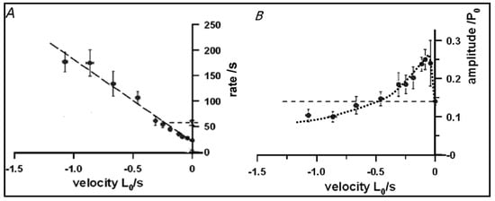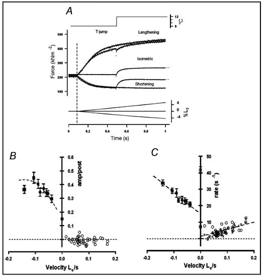 The T-jump experiments discussed above were on muscle fibres held isometrically, whereas it is known that the force that a muscle can develop changes with the velocity of filament sliding during steady muscle shortening and lengthening. At higher shortening velocities, force drops below the isometric force (P0), and falls to zero at the maximum shortening velocity. On the other hand, active muscle tension increases to ~2 × P0 as lengthening velocity increases to 1–2 L0 (muscle fibre lengths per second) [60,61,62]. See also the mammalian muscle data in Figure 7. Both the energy production and the acto-myosin ATPase rate increase with muscle shortening, and decrease with lengthening [63,64,65,66].