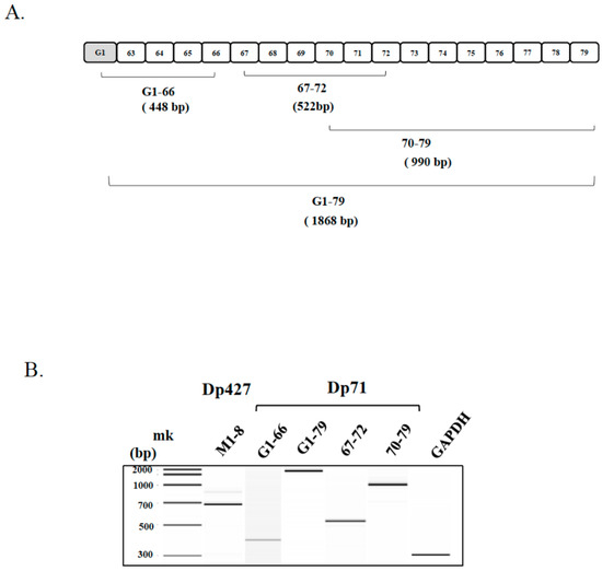 - Sarig, R.; Mezger-Lallemand, V.; Gitelman, I.; Davis, C.; Fuchs, O.; Yaffe, D.; Nudel, U. Targeted inactivation of Dp71, the major non-muscle product of the DMD gene: Differential activity of the Dp71 promoter during development. Hum. Mol. Genet. 1999, 8, 1–10. [Google Scholar] [CrossRef] [PubMed]