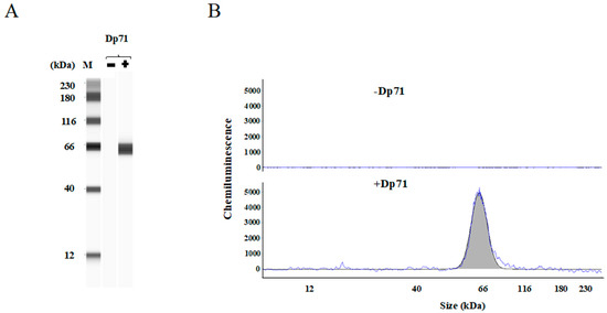 Detection of over-expressed Dp71 by the Simple Western. The Dp71 encoding plasmid was transfected into HEK293 cells and cell lysates were analyzed by the Simple Western using an antibody against the C-terminal of dystrophin. (A) Simple Western image pseudo-gel views of the molecular weight ladder and cell lysates are shown. A band near the 66 kDa molecular weight marker was identified in cells with the Dp71-expressing plasmid, but not in non-transfected cells; (B) electropherogram traces of cell lysates are shown. The Dp71 peak was not visible in non-transfected cells (−Dp71), whereas a band near the 66 kDa marker was observed in transfected HEK293 cells (+Dp71).