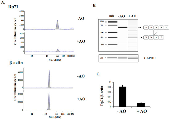 Dp71 protein in AODys75-3 treated CRL-2061 cells was assessed using the Simple Western method. The Dp71 peak was lower in AODys75-3 treated than in untreated cells (Figure 3A), whereas the β-actin peak was at a similar level in both (Figure 3A). Calculation of the AUCs of Dp71 and β-actin peaks in treated and untreated cells showed that the mean Dp71/β-actin ratio was 0.015 in treated cells and found 0.083 in untreated cells, confirming that disruption of the Dp71 reading frame with AO reduced the Dp71 AUC. These findings indicated that the Dp71 peak identified by the Simple Western was the product of Dp71 mRNA and that the Simple Western was sufficiently sensitive to detect changes in Dp71 expression in a small amount of protein sample.