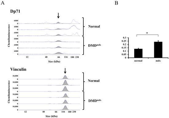 Dp71 in skeletal muscles from normal and mdx mice. (A) Skeletal muscles of C57BL/6 mice and DMDmdx mice were analyzed three times by the Simple Western, with the results shown as electropherogram traces. The Dp71 peak recognized by anti-dystrophin antibody, ab15277, was present in all three samples from normal and DMDmdx mice (top). Simultaneously, vinculin was analyzed as a loading control in the same samples (bottom). The arrows indicate the Dp71 and vinculin peaks; (B) the ratio of Dp71 to vinculin in samples from normal and DMDmdx mice. Dp71 to vinculin ratio was calculated from the AUC of each peak. Bars represent means ± S.EM. * p < 0.05 compared with normal mice.