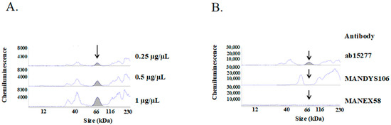Dp71 in human skeletal muscle. (A) Dose-responsive changes in the Dp71 peak. Human skeletal muscle lysates (SK1) were gradient diluted and analyzed by the Simple Western using an antibody against the C-terminal domain of dystrophin, ab15277. A peak corresponding to Dp71 was identified near 66 kDa marker, with peak height decreasing as loading protein decreased (arrow); (B) Dp71 not recognized by antibodies to the dystrophin rod-domain. The specificity of the Dp71 peak was examined with several primary antibodies, with results shown as electropherogram traces of the Simple Western. The peak was recognized by antibody against the C-terminal domain of dystrophin (ab15277) (shaded peak), but not by antibodies against the rod domain of dystrophin, including antibodies against exon 43 (MANDYS106) and exon 58 (MANEX58). The arrows indicate the Dp71 peaks.