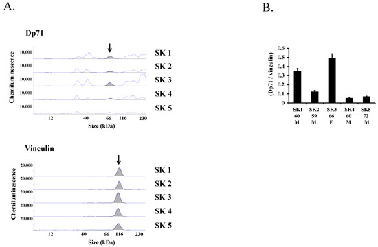 Compass software (Atlanta, GA, USA) was used to visualize the Simple Western lanes, to automatically analyze signal peaks, and to calculate the area under the curve (AUC) of each peak. The ratio of Dp71 to β-actin or vinculin was calculated as the AUC of the Dp71 peak divided by the AUC of the β-actin or vinculin peak.