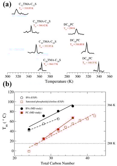 (a) Heat capacity profiles for DCPC and CTMA-CS IPA bilayers with various alkyl chain length. T values denote the maximum peak positions; (b) T versus alkyl chain length plots for DCPC and CTMA-CS IPA bilayers from MD (molecular dynamics) simulations (solid points) compared with experimental data (hollow points) [,,].