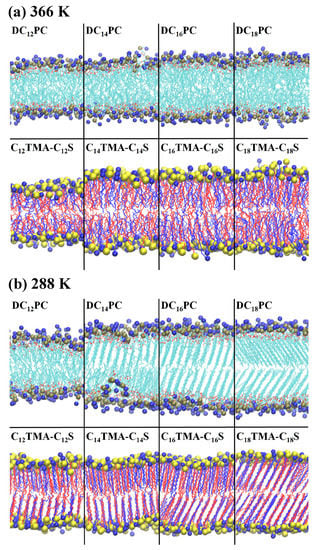 Series of MD simulations of PC and IPA bilayers were conducted to compare their structural and mechanical properties at molecular level. Figure 3 shows the representative configurations for the PC and IPA bilayers from equilibrium MD trajectories. At 366 K, all the tested PC and IPA bilayers exhibit disordered alkyl chain characteristics, indicating all systems are in Ld phase. At T = 288 K, all the tested IPA bilayers are in S phase with tilted and ordered alkyl chain packing, consistent with the reported T data of IPA []. However, the phase behaviors for PC bilayers at 288 K are more complicated than the biomimetic IPA systems. DCPC and DCPC bilayers with experimental T of 314 and 328 K, respectively, are indeed in S phase with high alkyl chain orders [,]. Meanwhile, DCPC bilayer exhibits staggered alkyl chain packing between the two leaflets at 288 K, suggesting the system is in the ripple phase. This is consistent with the experimental T of 297 K and the pre-transition temperature T of 283 K for DCPC [,]. In contrast, DCPC bilayer exhibits low alkyl chain ordering at 288 K. This indicates the system is in Ld phase at 288 K, consistent with experimental T of 271 K [,].