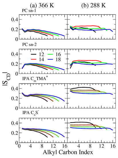 As revealed in Figure 6, the values for an S phase PC or IPA bilayer is one order of magnitude greater than the corresponding Ld phase system. This corresponds to the higher alkyl chain ordering within the S phase membrane. In addition, elongating the alkyl chain can significantly increase the value for both S phase PC and IPA bilayers but only causes gradual enhancements of for Ld phase systems. This indicates that the alkyl chain disordering compensates the enhancing effect on resulting from increasing the alkyl chain length.