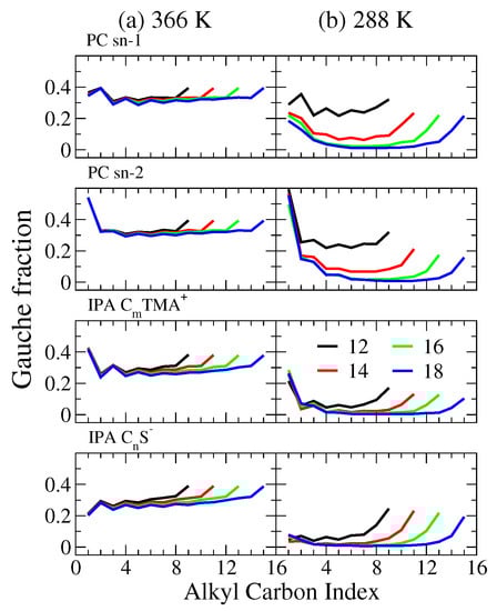 To further characterize the alkyl chain conformation, we analyzed the fraction of gauche conformers along alkyl chains as shown in Figure 5. Here, a gauche conformation is defined when the alkyl dihedral angle is in the range from −120 to 120. At 366 K, the gauche fractions slightly decrease with alkyl chain lengths for both PC and IPA bilayer systems, where the reduction is more pronounced for IPA systems. This indicates a more orderly alkyl chain packing resulting from the increased vdW interaction for the elongated alkyl chain. At 288 K, the gauche fractions for all IPA bilayers are near zero except for the first and the last two dihedrals, indicating the systems are in S phase where all alkyl chains are in fully extended conformations and tightly packed. For PC systems, since DCPC remains in the Ld phase at 288 K, its gauche fraction profile is similar to that at 366 K. For DCPC, which is in ripple phase at 288 K, its gauche fraction profile is around 0.1, between the values of 0.2 for Ld phase and nearly zero for S phase. This suggests a moderate alkyl chain packing order in the ripple phase. For the S phase, DCPC and DCPC systems at 288 K, the gauche fraction values are around zero at the middle alkyl chain segments, indicating densely packed alkyl chain conformations.