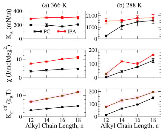 Three mechanical moduli for PC (black) and IPA (red) bilayers with various chain length, n, at (a) 366 and (b) 288 K: the area compressibility modulus (top panel), molecular tilt modulus (middle panel), and effective bending rigidity (bottom panel). The standard deviations were evaluated from three independent MD runs.