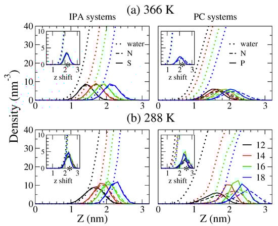 Transverse density profiles for water (dotted line), N atoms for the positively charged trimethylammonium of IPA and choline of PC (dashed line), and the negatively charged groups of S atoms for IPA sulfate and P atoms for PC phosphate (solid line) at (a) 366 and (b) 288 K, respectively. The color codes for the alkyl chain lengths are black, red, green, and blue for n = 12, 14, 16, and 18, respectively. The insets display the density profiles shifted with respect to the N atom distributions of the systems with the alkyl chain length of n = 18. The most probable positions for N are marked with star symbols (*). The densities for the hydrophilic groups are amplified 5 times for clarity.