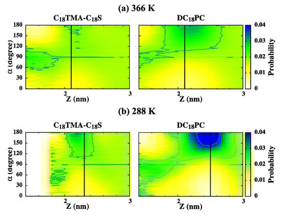 The hydrophilic composition can also affect water orientations, which are important factors for the hydrodynamic characteristics of the bilayer. The water orientation can be characterized via the angle between the electric dipole and the bilayer normal. Here, we analyzed the normalized water orientational angle distributions at various transverse positions z. Since the alkyl chain length has little effect on the water transverse distribution near the hydrophobic region for either the IPA or PC bilayer as illustrated in the insets of Figure 7, we only plotted the representative orientational data of the DCPC and CTMA-CS IPA bilayers at 288 and 366 K.