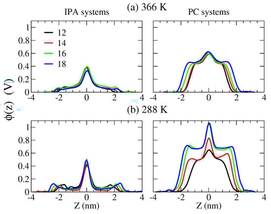 The different alignment of charged groups for PC and IPA also results in the variations in the electrostatic potentials for both membranes. The electrostatic potential was computed based on the Poisson’s equation via the double integration of the charge density profile [,]: