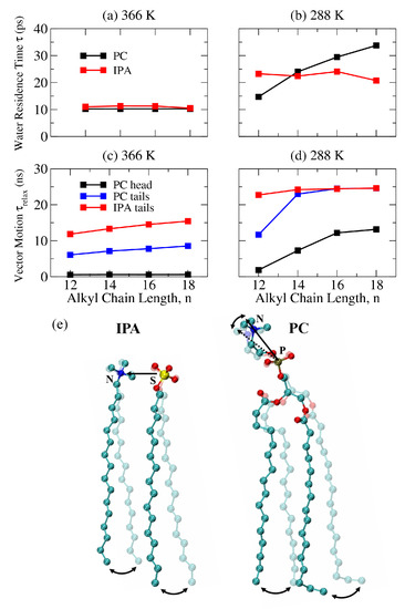 denotes the angle between the directive vector at time and , and is the second Legendre polynomial. was fitted to bi-exponential functions of for the convergence of integration [,]. Figure 10c,d illustrate the resulting for alkyl tilts within PC and IPA bilayers and the P–N vectors for PC systems. For a P–N vector, does not change significantly with the alkyl chain at 366 K; at 288 K, increases with the alkyl chain length, similar to the water residence time . Note that, as shown in Figure S3, the P–N vector distributions are similar for both Ld phase and S phase PC bilayers with a slightly larger averaged tilt angle at 366 K, indicating a more parallel orientation of the P–N vector in the membrane lateral direction in the Ld phase. These results suggest that a tilted P–N orientation has minor effects on the water residence time on the membrane surface. Meanwhile, for the alkyl chain has a similar trend toward the P–N vector result, suggesting that hydrophobic tilt relaxation correlates closely with hydrophilic groups for the PC bilayers. As demonstrated in Figure 10e, the longer alkyl chains lead to slower molecular tilting dynamics corresponding to larger values for P–N vectors and hence longer water residence time values. However, the charged hydrophilic groups are not covalently linked for an IPA complex. The tilting of alkyl chains are therefore decoupled with the IPA hydrophilic regions and have little effect on the water dynamics at the bilayer–water interface for both Ld and gel phases.