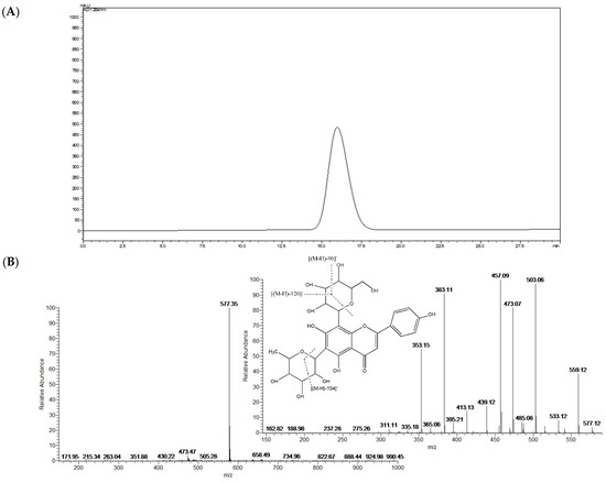 The compound isolated from the leaves of Dendrobium officinale was yellow and could be dissolved in methanol and water. The compound turned fuchsia after reaction with magnesite powder and HCl, which indicated that the compound was a flavonoid. In addition, the results of the Molisch reaction were positive, which confirmed that the compound was a flavonoid glycoside. The chemical reaction test also indicated that the compound was a flavonoid glycoside. UV experiments revealed absorption peaks at 216 nm, 271 nm, and 336 nm, similar to the characteristic absorption of flavonoids in the presence of UV. The purity of the compound was greater than 98% as determined by HPLC (Figure 1A). The ESIMS results showed that the m/z of the compound was 577 [M-H]−; therefore, the molecular weight of the compound was 578, and the molecular formula of the compound was C27H30O14, which was previously described in Dendrobium officinale by Ye et al. [26]. The MS and MS2 spectra of C27H30O14 are shown in Figure 1B.